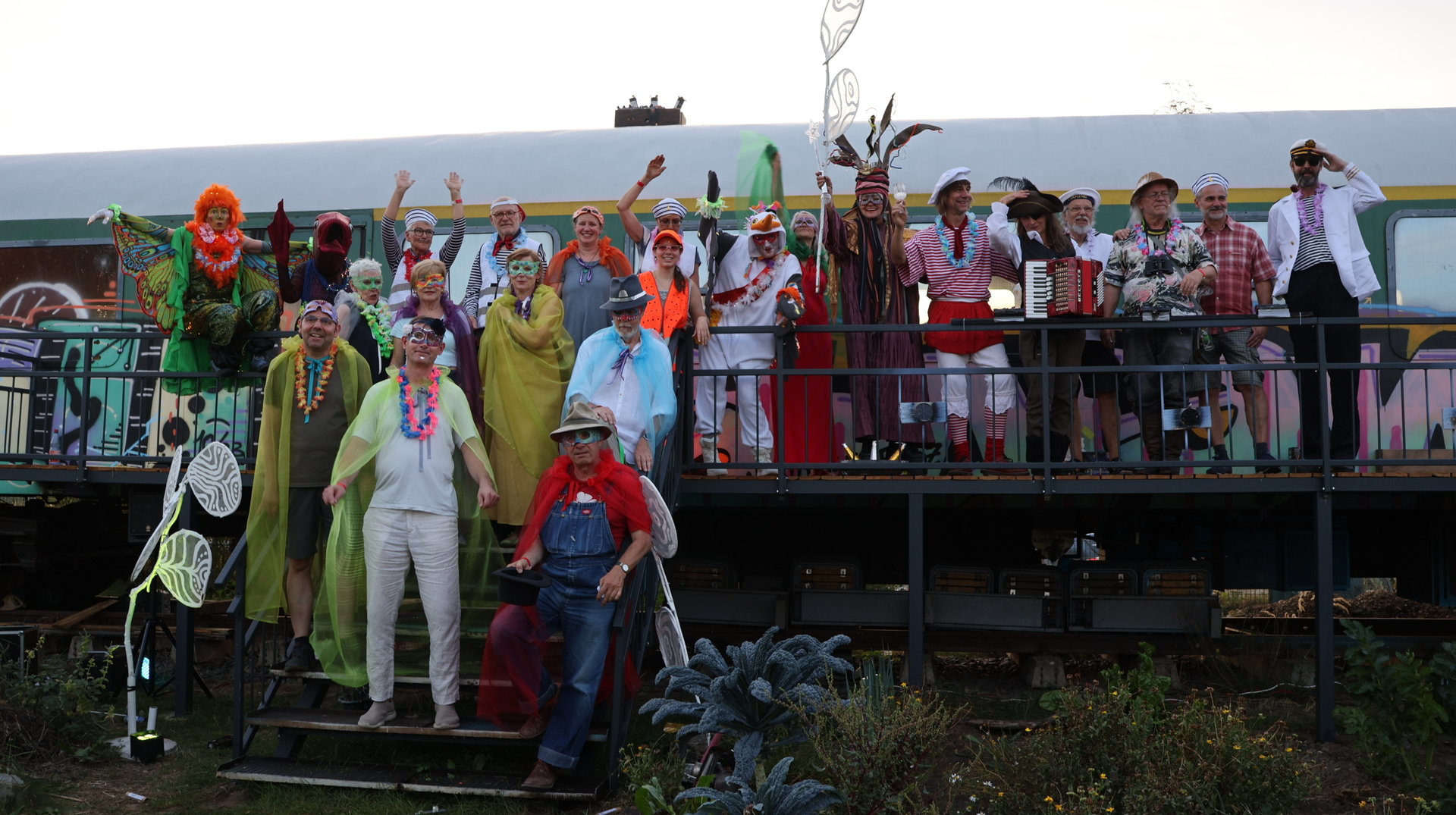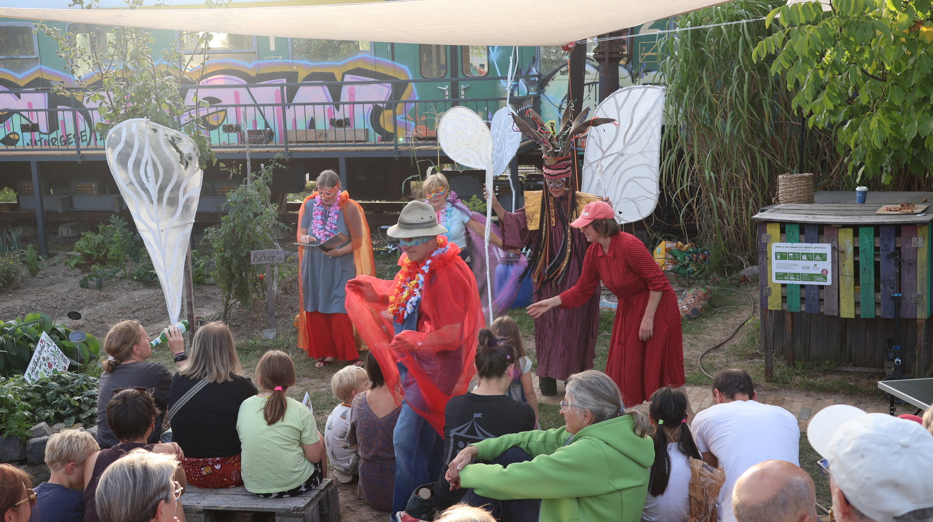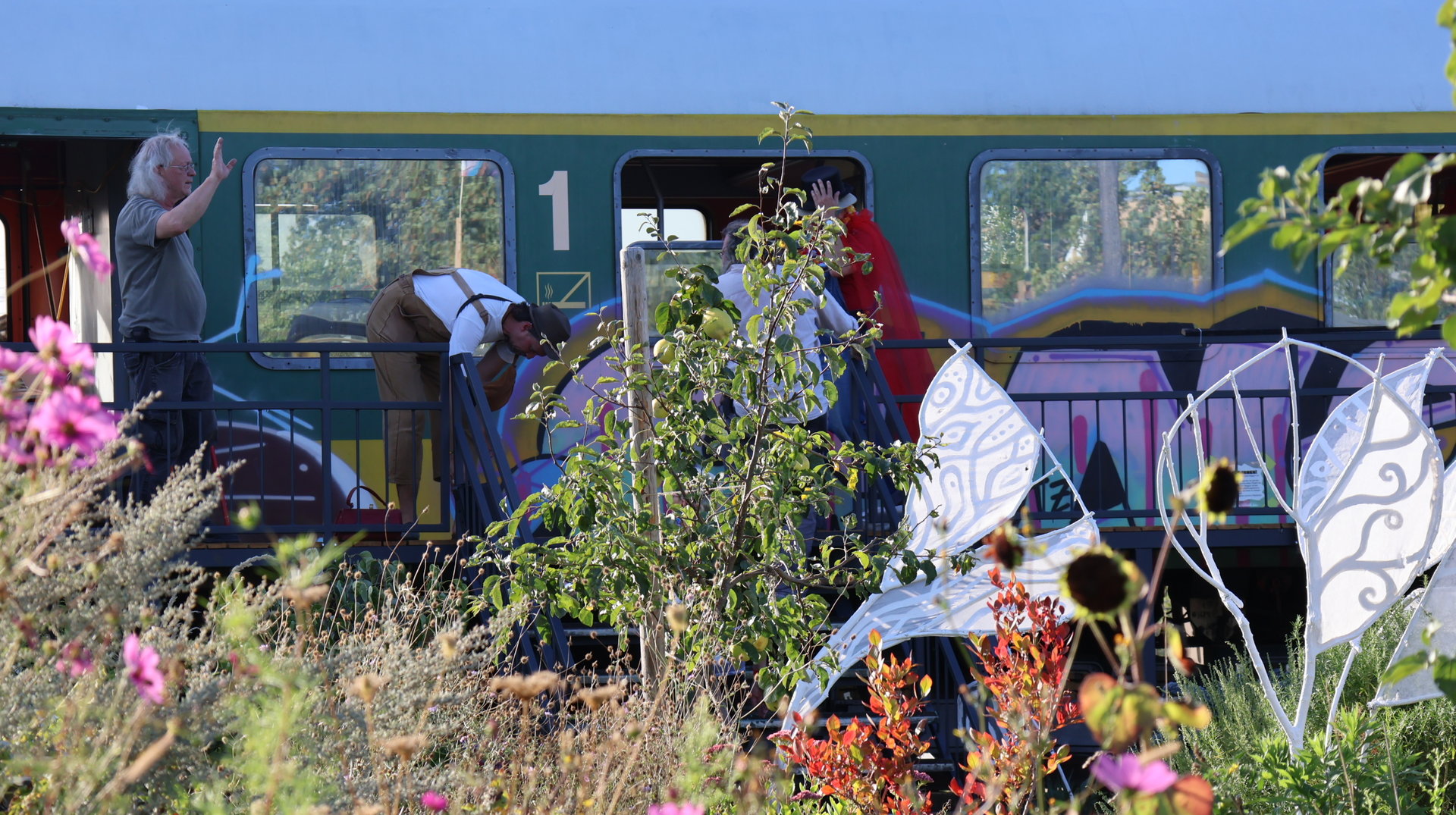 Vormittags ginge los mit einem Sensen-Workshop mit Ekkehard Unger . Ab 12 Uhr wurden wir gemeinsam beim Workshop Sonnendruck kreativ und haben aus kleinen Hildegarten-Funden und Papierresten Kunstwerke mit der Sonne gezaubert. Die Bibliothek Plagwitz war dieses jähr auch wieder mit einer Bastelaktion und Geschichten für Groß und Klein mit dabei. Außerdem konntet ihr euch über verschiedenste Themen informieren: Martin Schlegel hat an seinem Stand seine Peer-Beratungvorgestellt. Es gab einen Infostand von foodsharing und der Aktionswochen für gentechnikfreies Essen. Zum Abschluss des Co-Ups gab es ein besonderes Highlight: Das Theaterstück „Arche Inklusia“. Eine musikalisch-performative Reise ins Paradies mit Expeditionen und Landgängen im „Garten der Seligen“. Mit dabei waren das Theater aus dem Hut, Fröhlicher Chor und denkmalsozial aus Leipzig und Torgau. Artisten und verwandlungsfreudigen Amateur*innen mit und ohne Behinderung. Und: Der Waggon wurde eingeweiht!