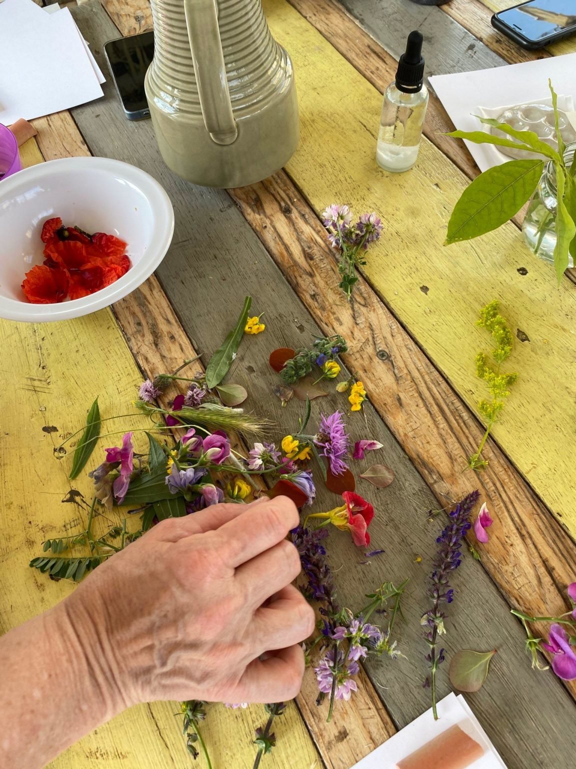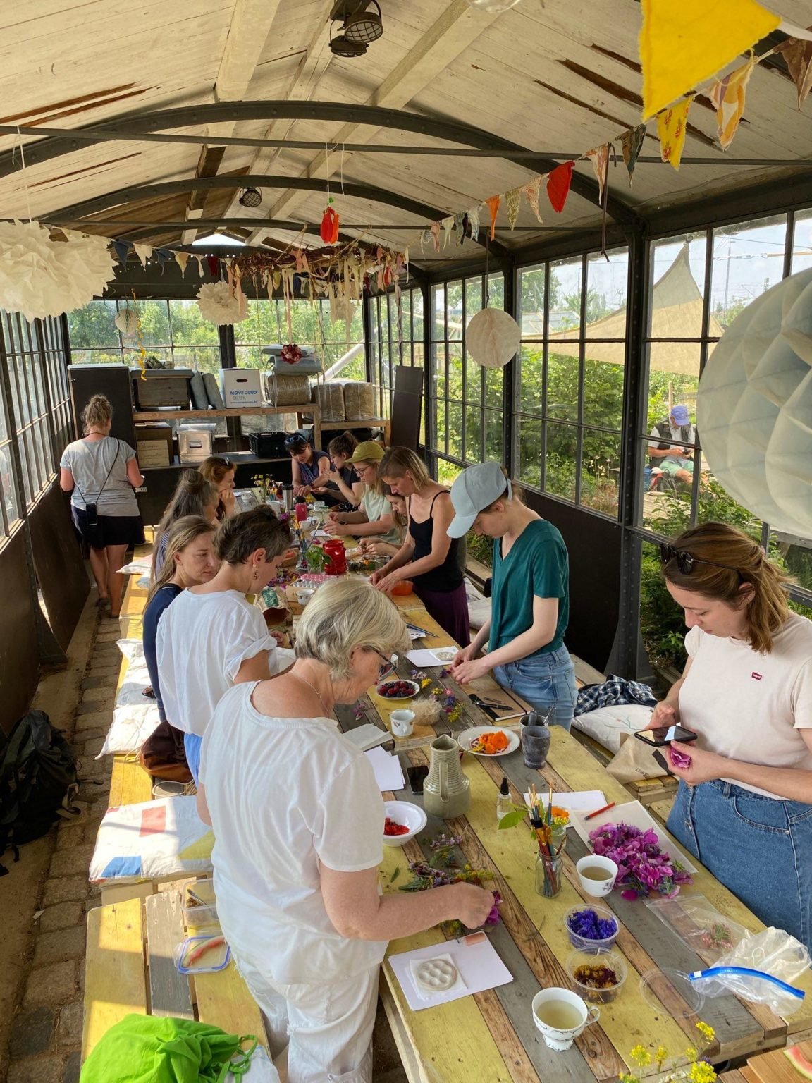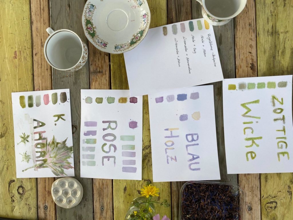 Vom zeitigen Frühling bis zum späten Herbst beschenkt uns die Natur mit wundervollen Farben. In diesem Workshop haben wir uns damit beschäftigt, wie wir diese zum Malen und Färben gewinnen können. Dazu haben wir Blüten und Blätter rund um das Gelände des Hildegartens gesammelt. Aus den gesammelten Schätzen konnten wir dann die bunten Säfte herstellen. Durch die Zugabe veschiedener Salze, konnten wir aus jeder Pflanze unterschiedliche Farben gewinnen: mal Zarte, mal Leuchtende und mal Intensive. Wir lernten wie Kreiden entstehen und wie aus den sich schnell verflüchtigenden Säften dauerhafte Pigmente gewonnen werden können. Uns wurde gezeigt, wie dies für Aquarell- und Wasserfarben genutzt werden kann.