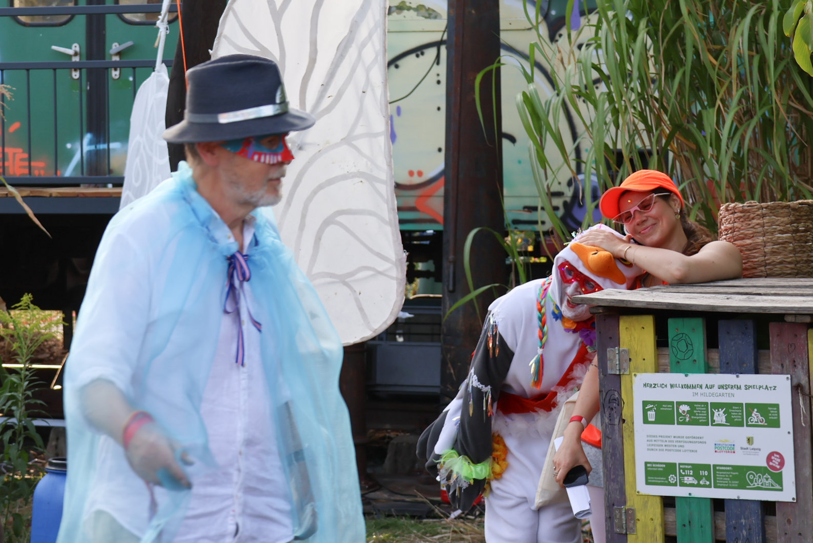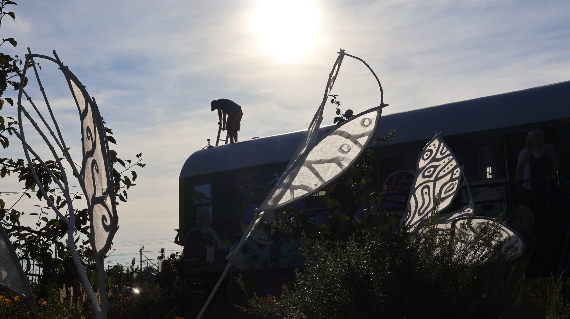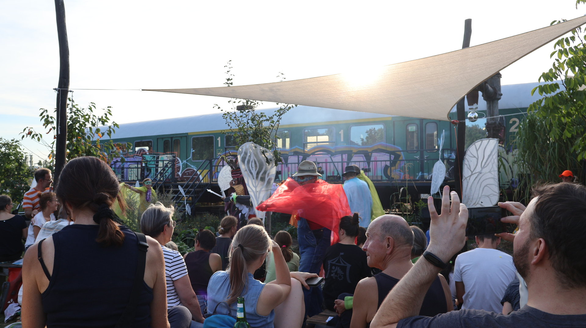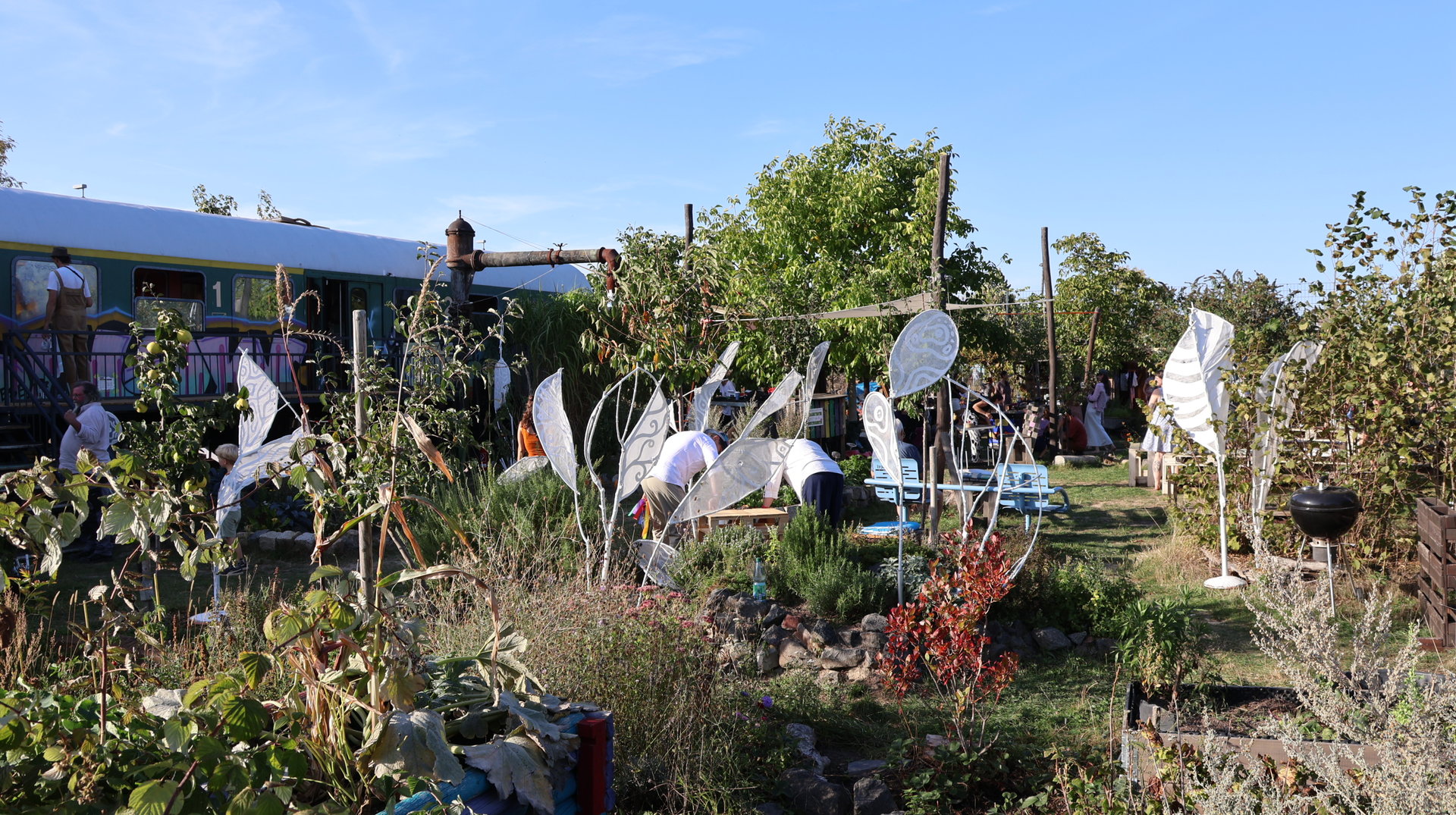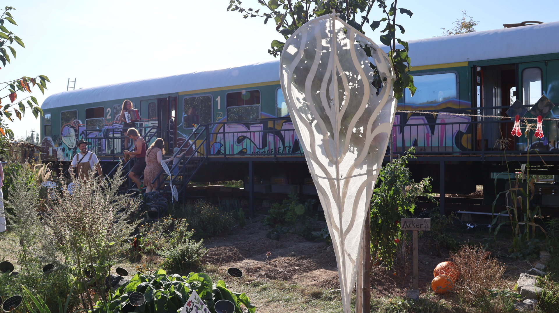 Vormittags ginge los mit einem Sensen-Workshop mit Ekkehard Unger . Ab 12 Uhr wurden wir gemeinsam beim Workshop Sonnendruck kreativ und haben aus kleinen Hildegarten-Funden und Papierresten Kunstwerke mit der Sonne gezaubert. Die Bibliothek Plagwitz war dieses jähr auch wieder mit einer Bastelaktion und Geschichten für Groß und Klein mit dabei. Außerdem konntet ihr euch über verschiedenste Themen informieren: Martin Schlegel hat an seinem Stand seine Peer-Beratungvorgestellt. Es gab einen Infostand von foodsharing und der Aktionswochen für gentechnikfreies Essen. Zum Abschluss des Co-Ups gab es ein besonderes Highlight: Das Theaterstück „Arche Inklusia“. Eine musikalisch-performative Reise ins Paradies mit Expeditionen und Landgängen im „Garten der Seligen“. Mit dabei waren das Theater aus dem Hut, Fröhlicher Chor und denkmalsozial aus Leipzig und Torgau. Artisten und verwandlungsfreudigen Amateur*innen mit und ohne Behinderung. Und: Der Waggon wurde eingeweiht!