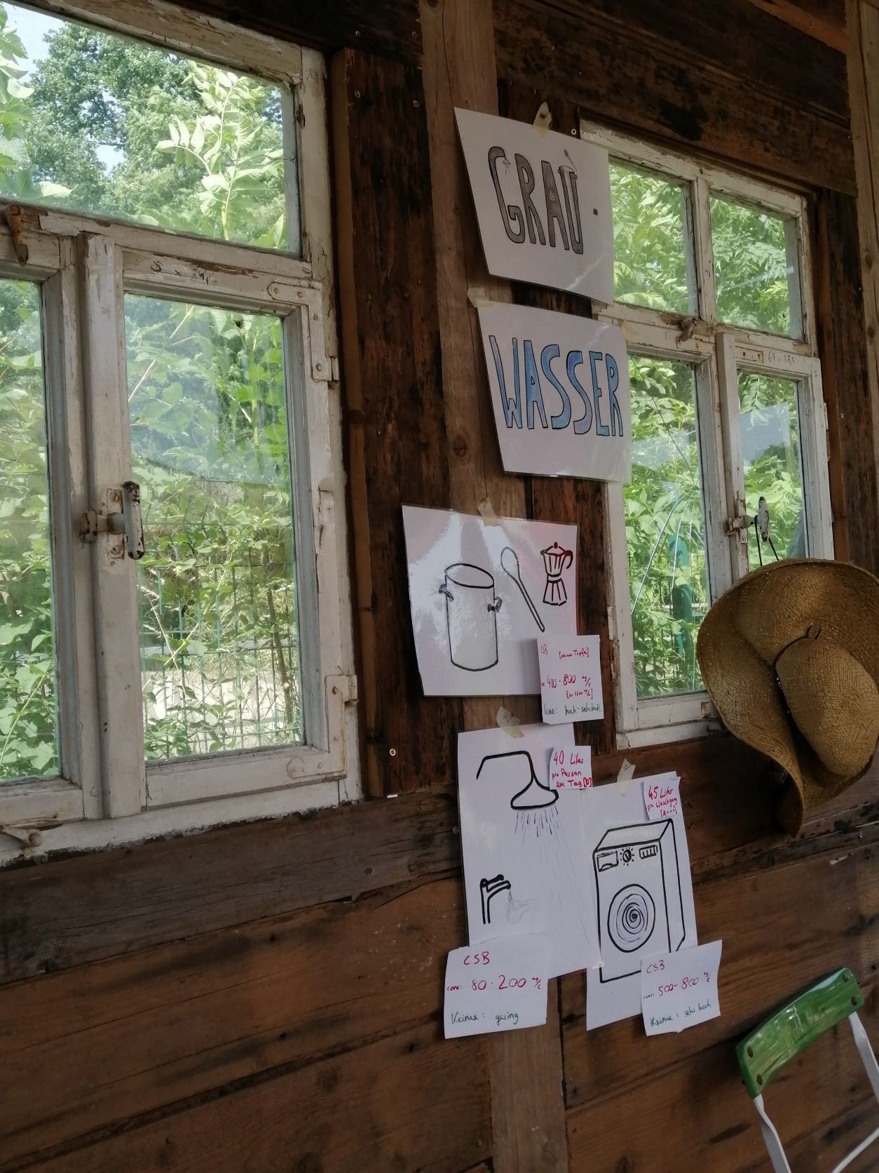 Der Fokus wurde dabei auf das im Garten anfallende Grauwasser gelegt. Von Grauwasser ist die Rede, wenn Wasser durch die Reinigung von Wäsche, beim Spülen oder Duschen vor allem durch Seifen und Reinigungsmittel verunreinigt wird. Es erscheint danach gräulich bis milchig. Konkret heißt das, auf den Gemeinschaftsgarten DILL übertragen, dass die zu bauende Anlage bis zu 30l Grauwasser aus dem Spülen des dreckigen Geschirrs reinigen soll. Das geschieht vor allem durch die Aneinanderreihung verschiedener Materialen mit jeweils unterschiedlichen Filter – und chemischen Eigenschaften.