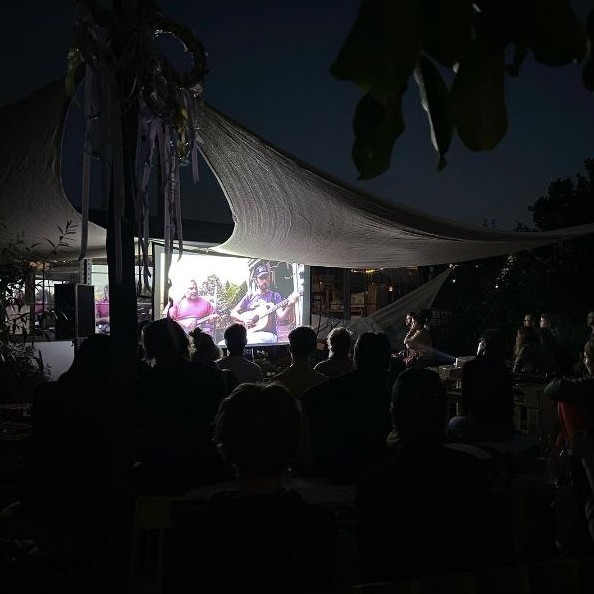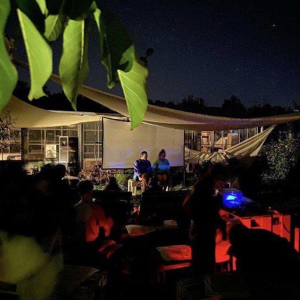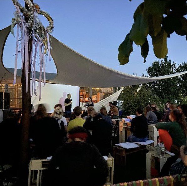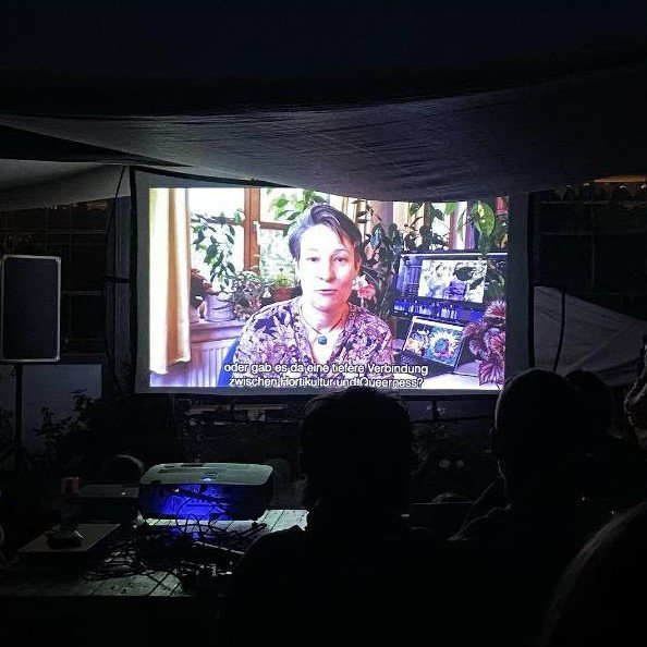 Im Anschluss zum Film gab es im Hildegarten ein Gespräch zu Theorie und Praxis von Ökofeminismus und Queer-Ecologies mit Manuel Wagner und Lina Hansen.