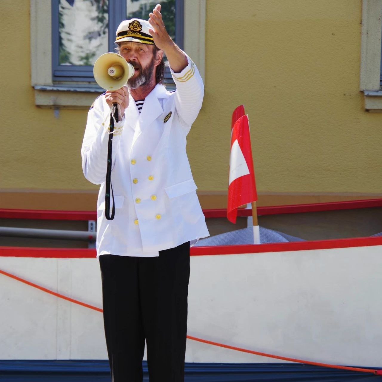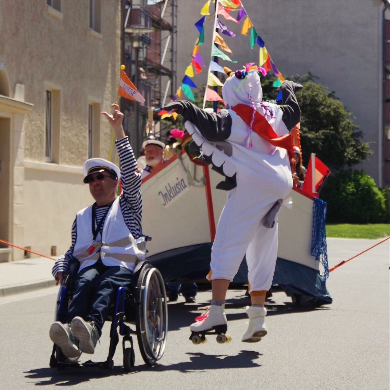 Die Besatzung dieses außergewöhnlichen Schiffes bestand aus einer vielfältigen Gruppe von Menschen: professionellen Künstler*innen, Menschen mit Behinderungen, kreativen Senior*innen und engagierten Bürger*innen. Gemeinsam führten sie eine interaktive Theaterperformance durch die Straßen von Torgau zum Laga-Gelände, begleitet von humorvollen Zwischenstopps und inspirierenden Momenten.