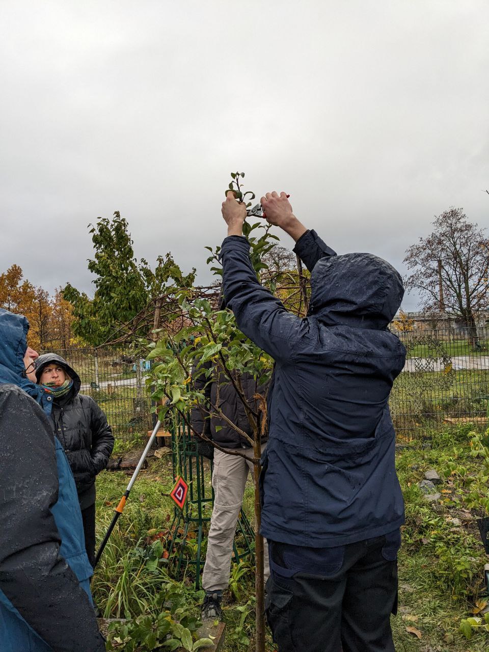 Im Anschluss an die Pause ging es an den Praxisteil des Tages. Wie haben damit begonnen Bäume anzusprechen, sie zu bestimmen, ihr Alter zu schätzen und uns ihren Wuchs anzuschauen. Gemeinsam haben wir darüber geredet, welchen Wuchs wir bei dem Baum anstreben, wie, wann und wo wir Äste abschneiden können/sollten und haben dies dann auch in die Tat umgesetzt.