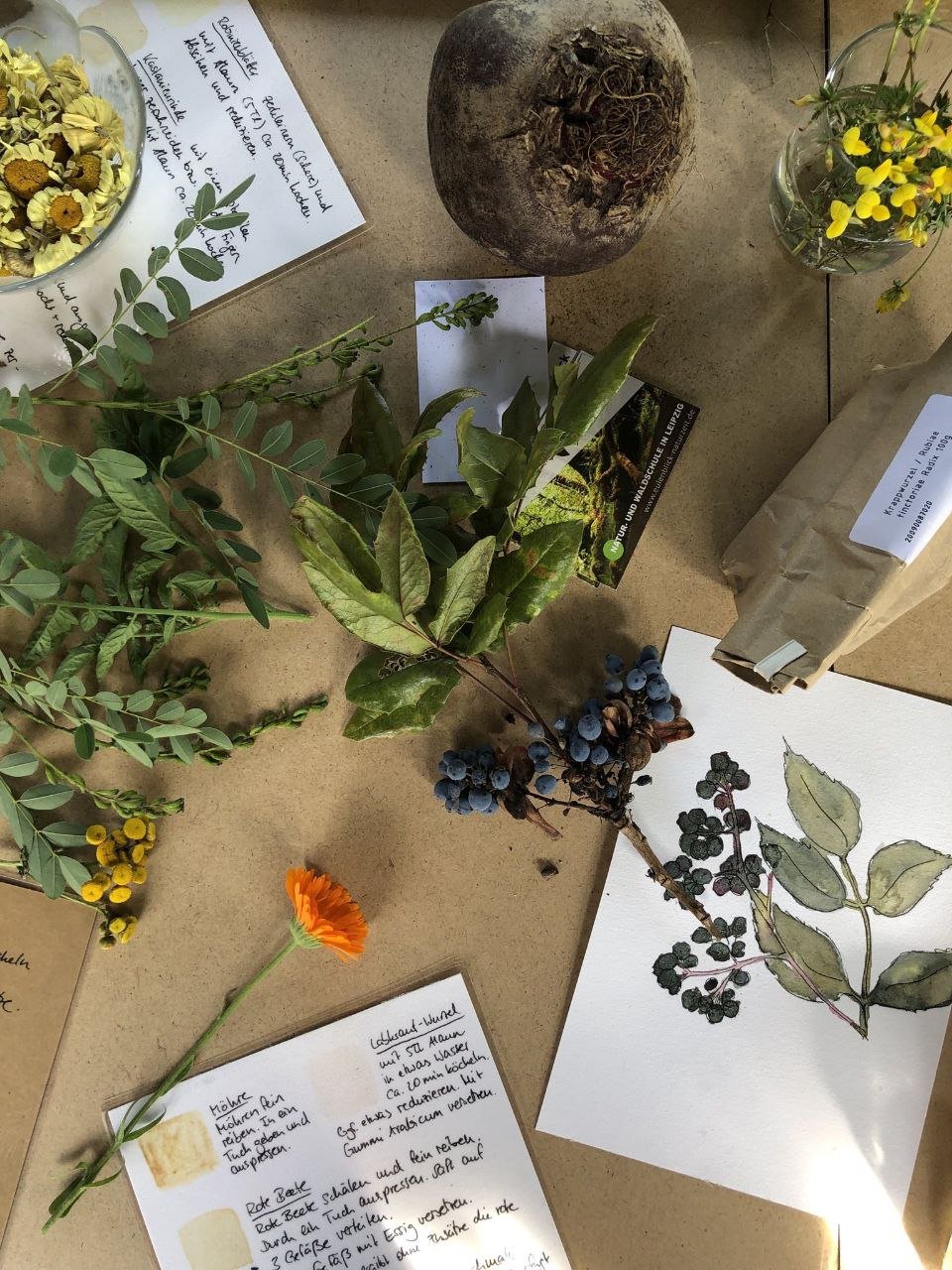 In diesem Workshop haben wir mit den Pflanzenfarben der Natur experimentiert! Aus Kräutern, Blüten und Beeren haben wir Pflanzenfarben extrahiert und gelernt, was es dabei zu beachten gilt. Wir haben z.T. mit giftigen, zum Teil mit genießbaren Pflanzen gearbeitet und dabei die unterschiedlichsten Eigenschaften verschiedener Gewächser näher kennengelernt. In unserem artenreichen Gemeinschaftsgarten DILL fanden wir ein üppiges Angebot an nutzbaren Blättern und Beeren vor, mit dem wir direkt vor Ort mit der Farbgewinnung starten konnten.