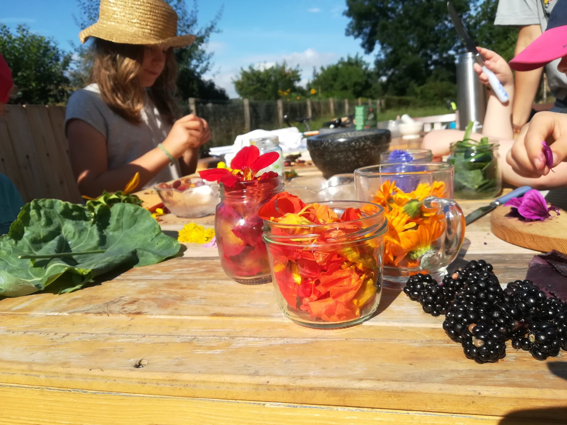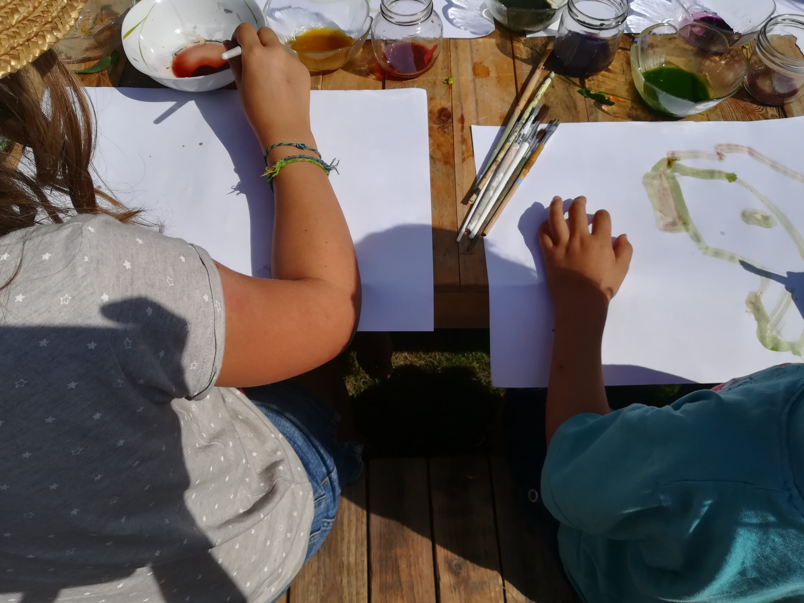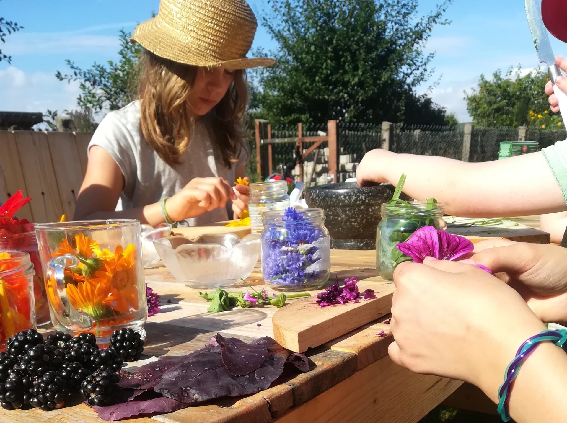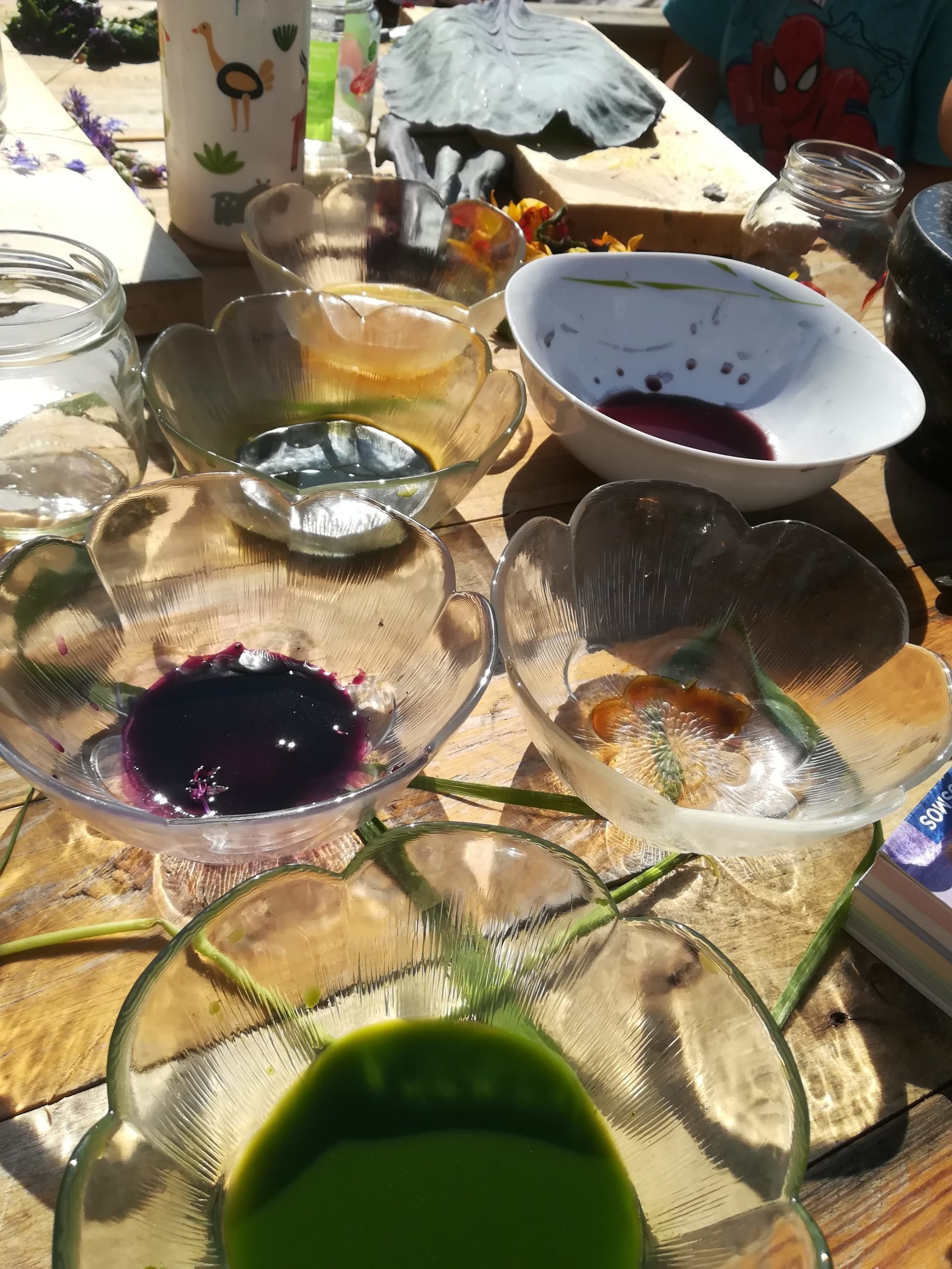 Zu Beginn der Sommerferien haben wir mit Kindern im Gemeinschaftsgarten DILL aus Pflanzen Farben hergestellt und mit ihnen gemalt. Dazu haben wir nur Pflanzen genutzt, die im Garten wuchsen: Blüten und Blätter der Kapuzinerkresse, Kornblumenblüten, Ringelblumen, Sonnenblumen und Brombeeren. Daraus sind viele schöne Farben und Bilder entstanden.