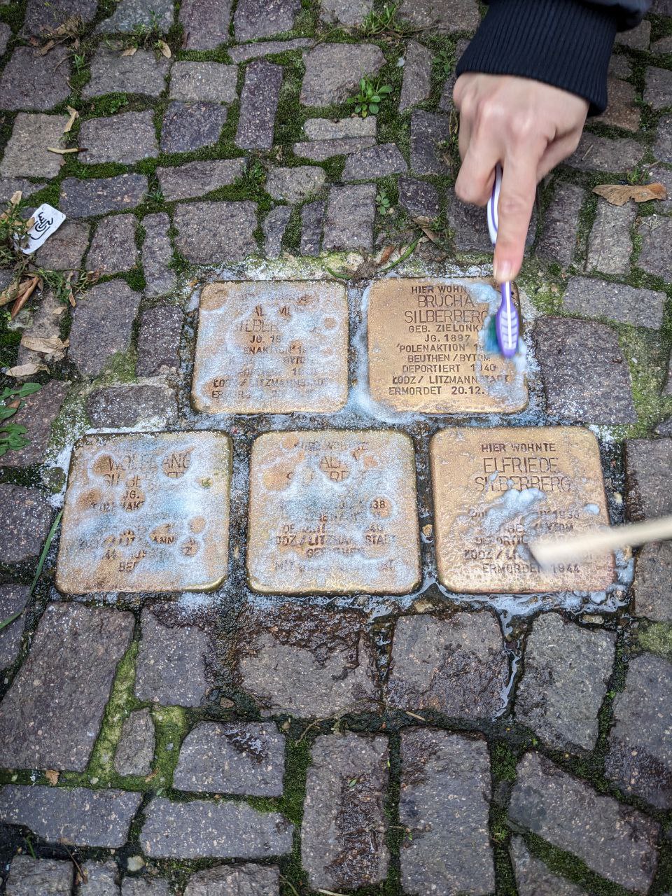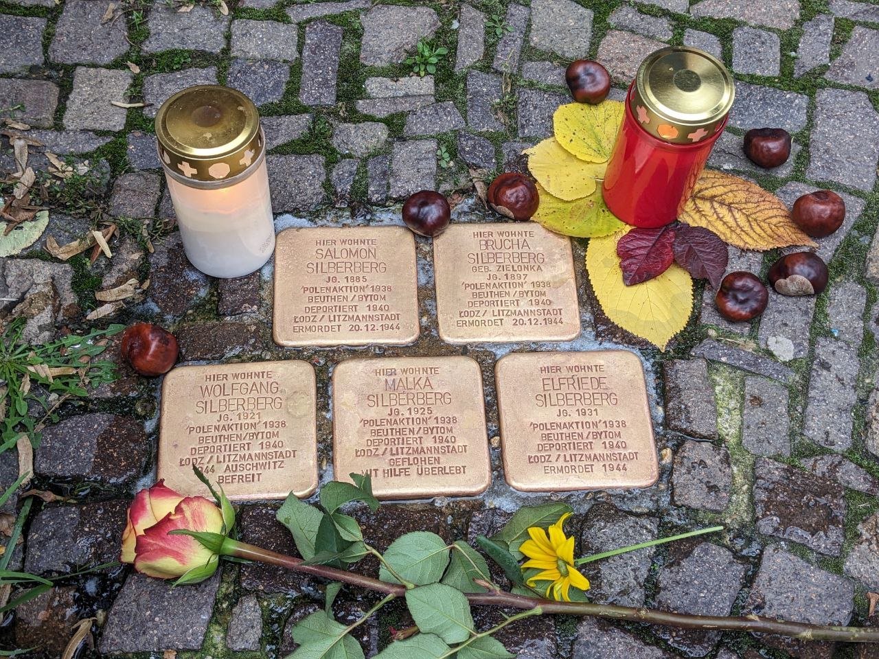 1938 brannten im gesamten Deutschen Reich Synagogen. Zum 85. Jahrestag dieser Übergriffe haben wir am 09. November den Opfern der Reichsprogromnacht gedacht, und all derer, die noch gefolgt sind. Im Gedenken an die Verstorben haben wir die Stolpersteine Familie Silberberg geputzt, von Salomon Chaim, Brucha, Wolfgang, Malka und Elfriede.
